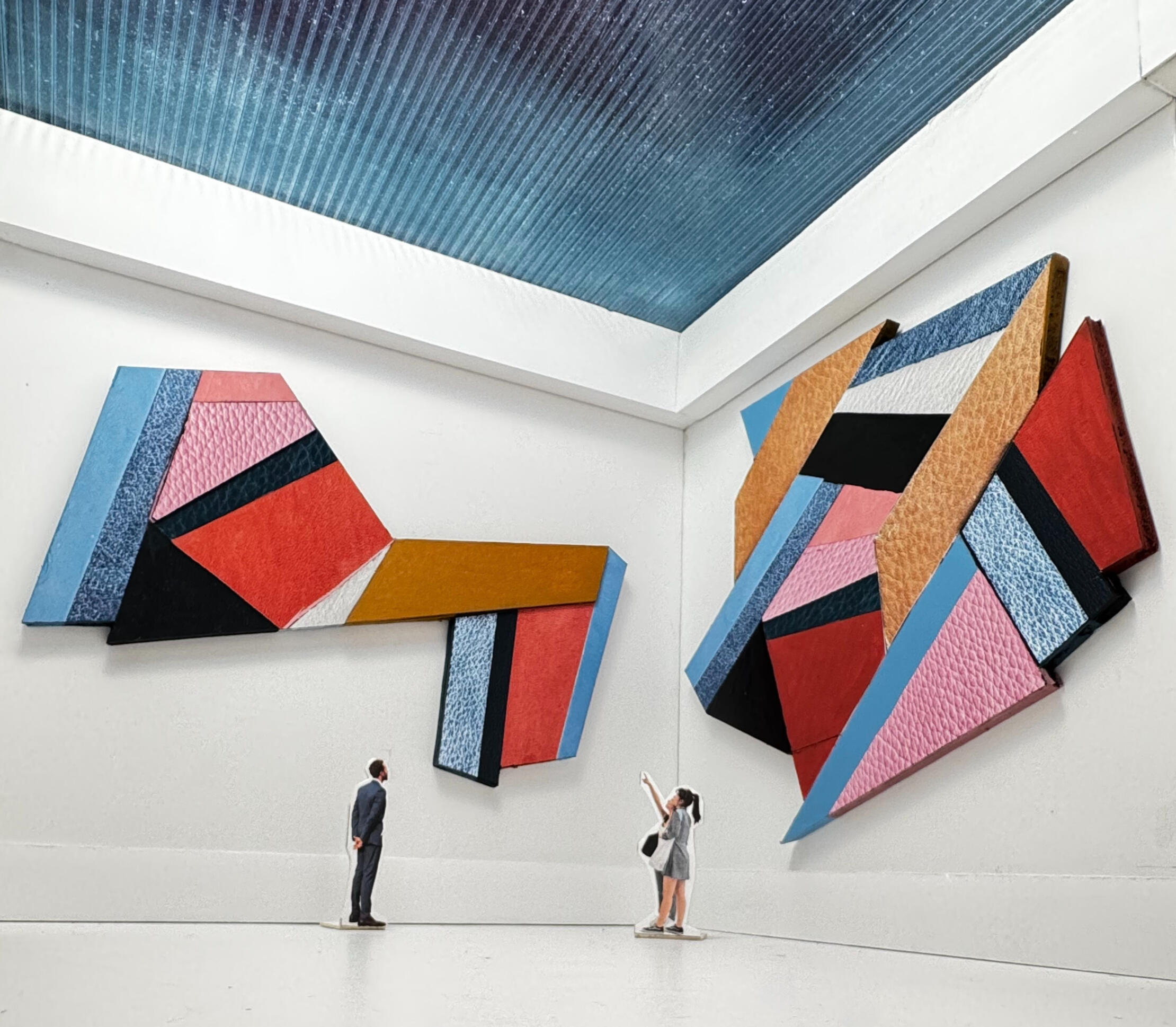 The curators of the space are interested in a series of low-relief, highly chromatic wall pieces. In response, Cielo proposes mixed media reliefs on colorful backgrounds with shapes inspired by Nordic runes. Pieces will be hung in traditional gallery style and, as needed, track lighting consistent with decor standards of the gallery will be introduced. [CLICK ON THE IMAGES ABOVE FOR ENLARGED MODEL VIEWS]